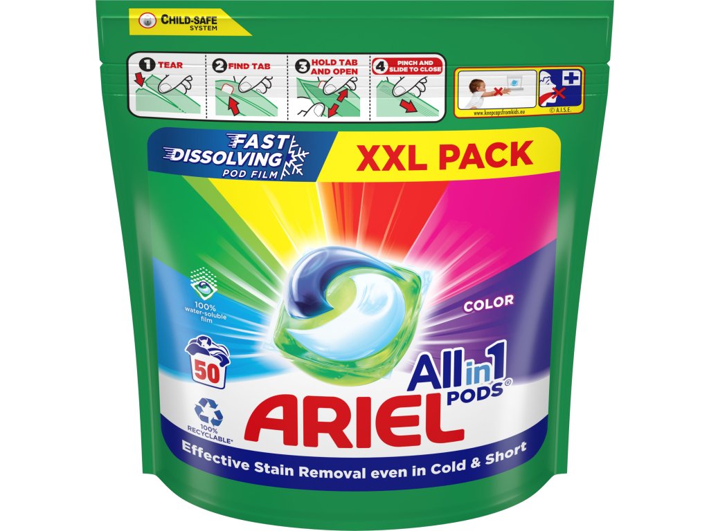 - Mimoriadna čistiaca sila v jednej malej kapsule. Gélové kapsuly na pranie Ariel All in 1 Pods Color majú jedinečný viackomorový dizajn, ktorý udržiava zložky stabilne oddelené, až kým sa nenamočia, vďaka čomu prinášajú vynikajúcu koncentrovanú čistiacu silu. Inovatívny obal tabliet na pranie Ariel sa pri kontakte s vodou úplne rozpustí a uvoľní účinné zložky, ktoré si poradia s celou škálou rôznych škvŕn. Je to najlepší tekutý prací prostriedok od Arielu so správnym dávkovaním. Na získanie mimoriadnej hebkosti a sviežosti používajte spolu s avivážami Lenor a vonnými perličkami do prania Unstoppables.