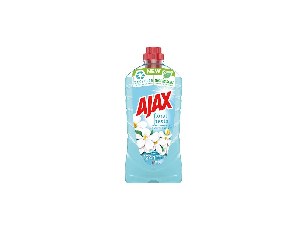 Objevte Ajax Floral Fiesta Jasmine s esenciálními oleji pro jasně čisté povrchy a příjemně svěží domov až 24 hodin po čištění. Vůně jasmínových květů. Prací prostředek pro všechny povrchy v domácnosti. Dokonalá čistota, zářivý lesk, bez oplachování.